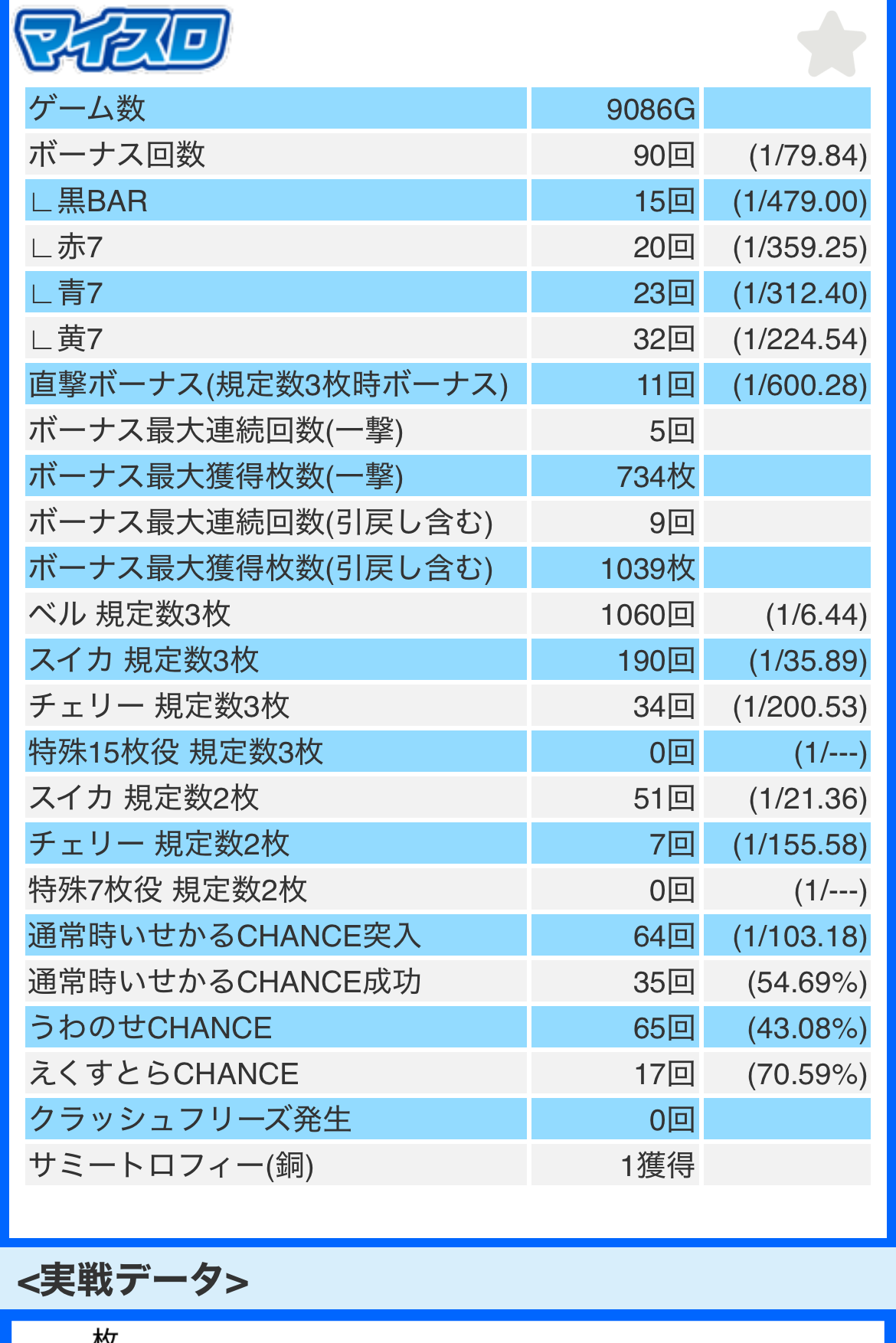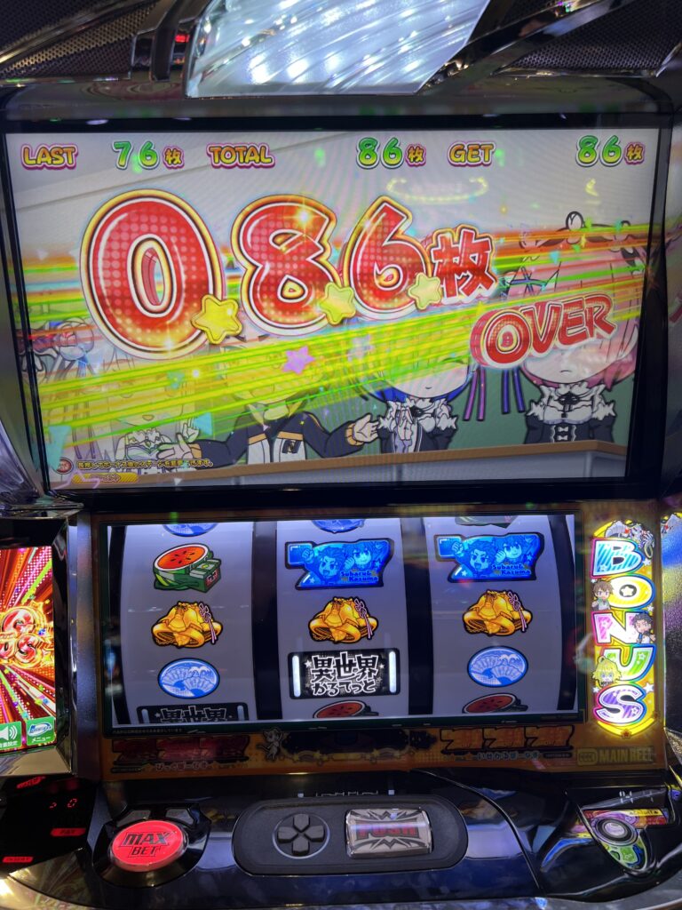 もう少し時間があったけど、いせかるチャンス6スルーくらいしてげんなりしたので086枚オーバーにかけて、9086Gで辞め!