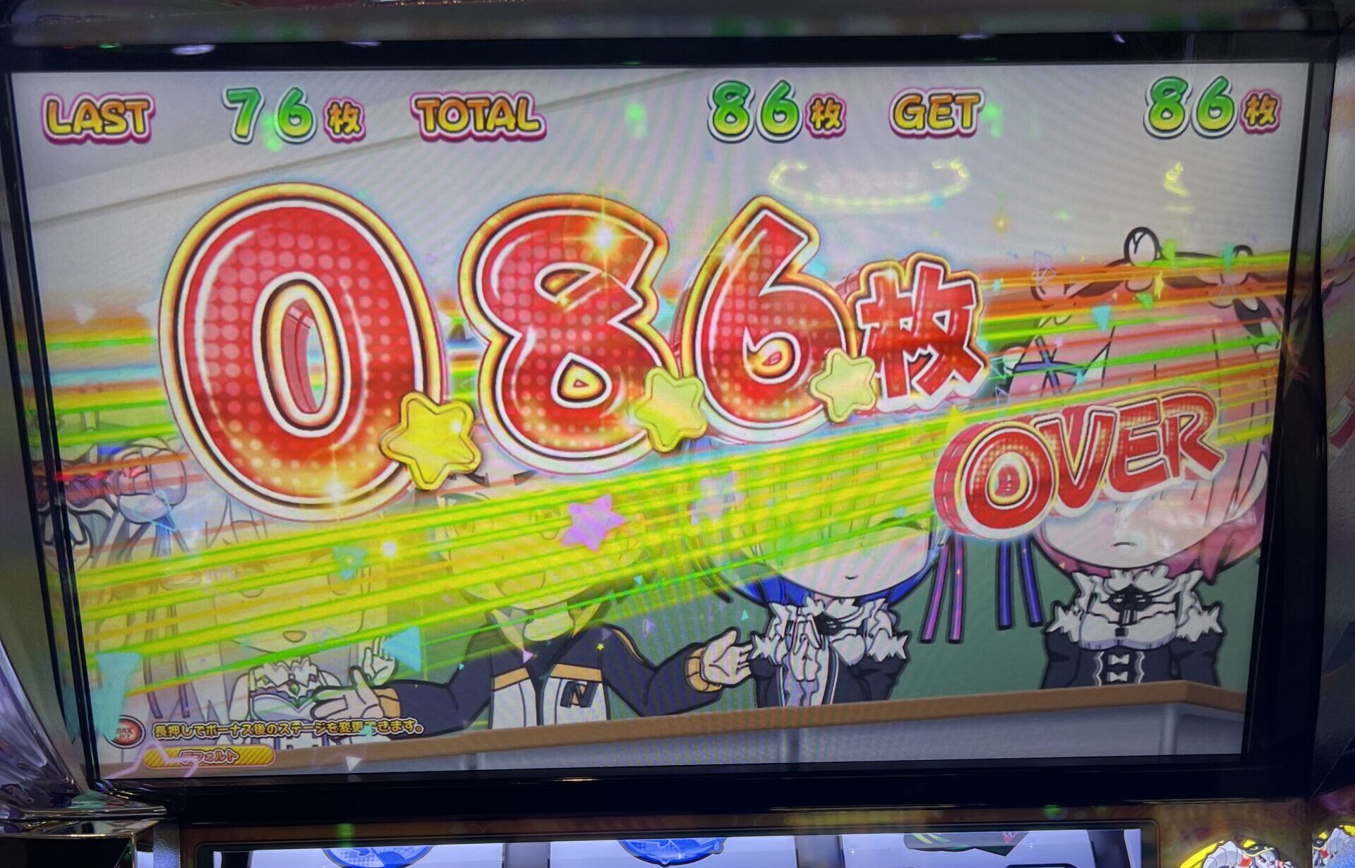 もう少し時間があったけど、いせかるチャンス6スルーくらいしてげんなりしたので086枚オーバーにかけて、9086Gで辞め!