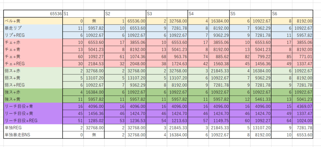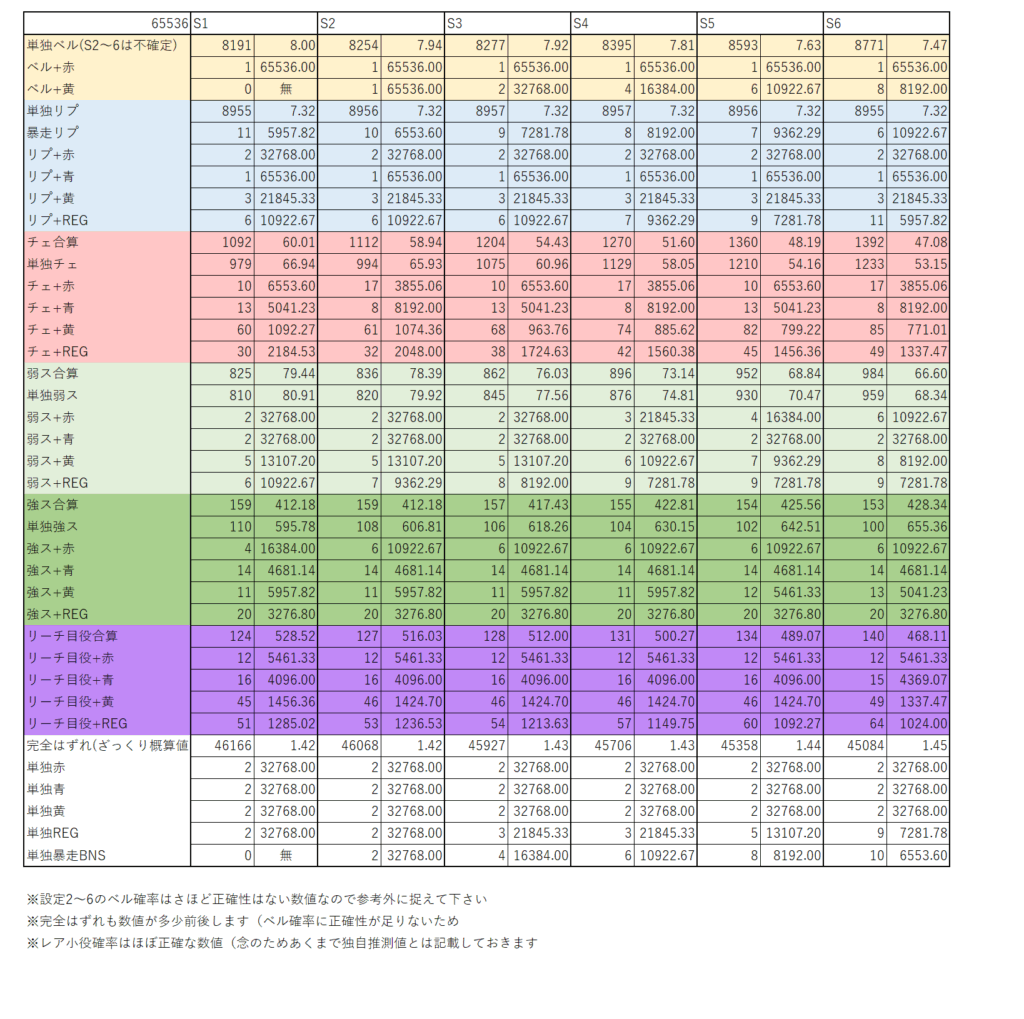 大分すっきりしましたね。上記ボーナス以外は引いても一切設定判別の役には立たないということでもあります。ちょっと特殊な<暴走リプ>と<チェ+赤/青(赤青の奇遇判別要素はこれのみ)>と<リーチ目役+青>を除いた【1/295.2(設定1)~1/206.7(設定6)】が本機種のボナによる設定差がついている所となっています。つまり、これらのボーナスはしっかりと見極めていきたいってことですね。前置き終わり。