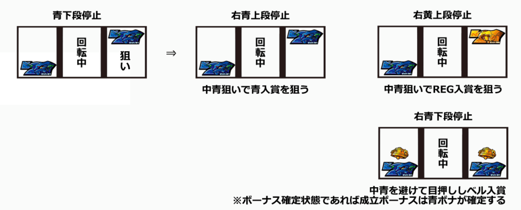 左リール下段に青7狙いし、赤上段停止で赤狙い(赤中段なら右バー目安チェリー狙いつつ赤なら直入賞(赤成立してなきゃチェリー入賞)、下段青停止時は右上段に青狙い、青下段テンパイ時は中青を避けて目押し(次ゲーム再度入賞手順②)、右青or黄色停止時は中青狙いで青とREG入賞。